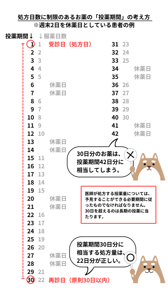 たとえば、仕事中症状を抑える目的で服薬しており、仕事が休みの日は服薬しない、という服用スタイルの患者さんの例を挙げます。会社の営業日はカレンダー通りとします。この場合、1回の処方量を「1日分×30で30日分」とするのは誤りです。基本的に、平日5日服用・週末2日休みのパターンなのに、30日分のお薬を渡したら、投薬期間42日分に相当してしまいます。投薬期間30日間のうち、休薬日を除く服薬日は、22回あります。つまり、このケースでは、投薬期間30日分に相当する適切な処方量は、22日分が正となります。